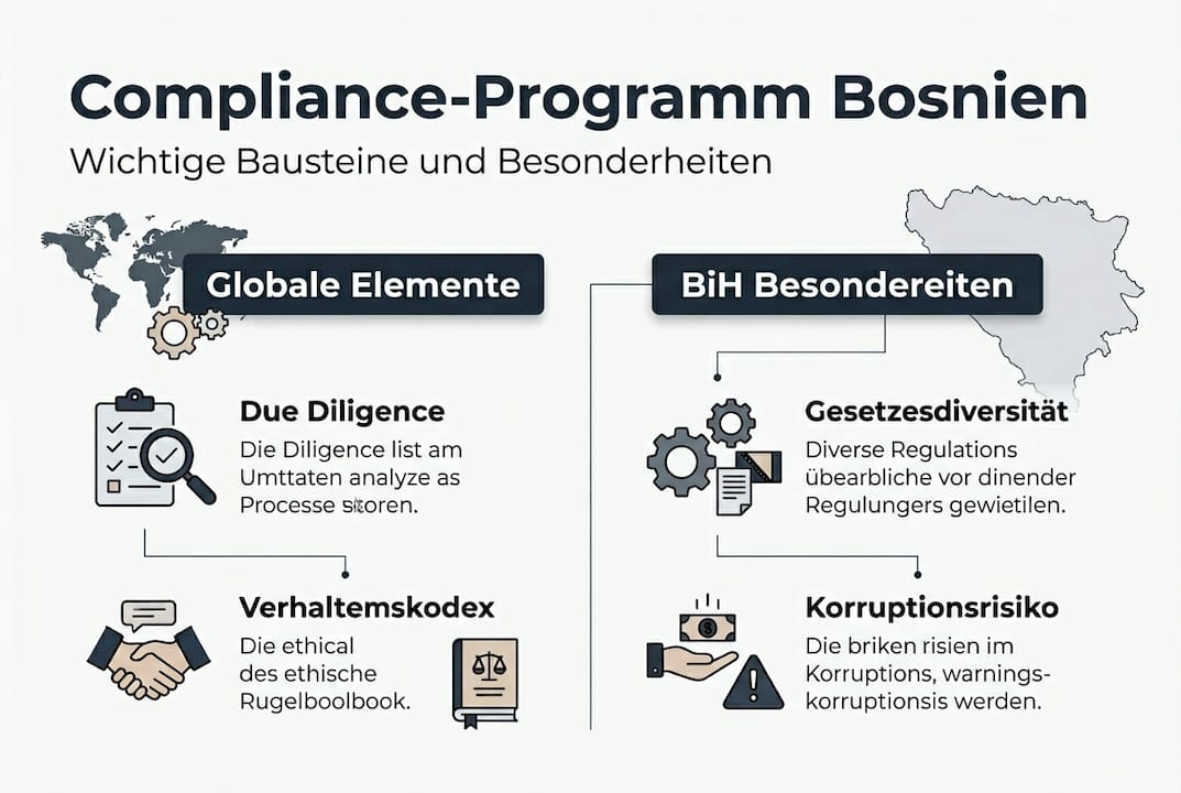 Pflichtbestandteile sind klare Verantwortlichkeiten, ein Code of Conduct, Risikoanalysen, Schulungen, interne Kontrollen sowie kontinuierliche Überwachung. Diese Elemente müssen auf die spezifischen Rechtspflichten in BiH abgestimmt sein.