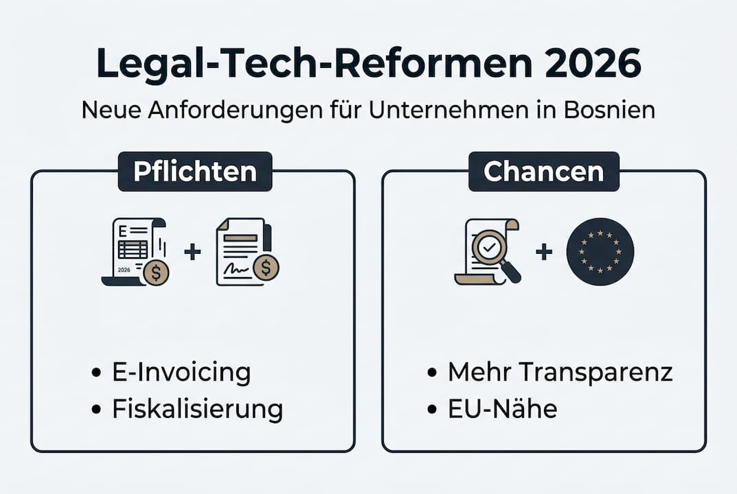 Ab 2026 sind in Bosnien und Herzegowina sämtliche Rechnungen ausschließlich elektronisch mit Echtzeit-Verifizierung zulässig. Diese Regelung betrifft jedes Unternehmen, das im Land tätig ist, und verändert Compliance-Anforderungen grundlegend. Gleichzeitig rollen digitale Justizreformen, neue Datenschutzgesetze und erste KI-Regulierungsansätze durch die gesamte Balkanregion. Wer 2026 in Bosnien und Herzegowina investiert oder expandiert, muss diese Entwicklungen kennen und verstehen. Dieser Artikel erklärt die wichtigsten Legal-Tech-Trends, vergleicht regionale Ansätze und zeigt konkrete Handlungsoptionen für internationale Unternehmen und Investoren.