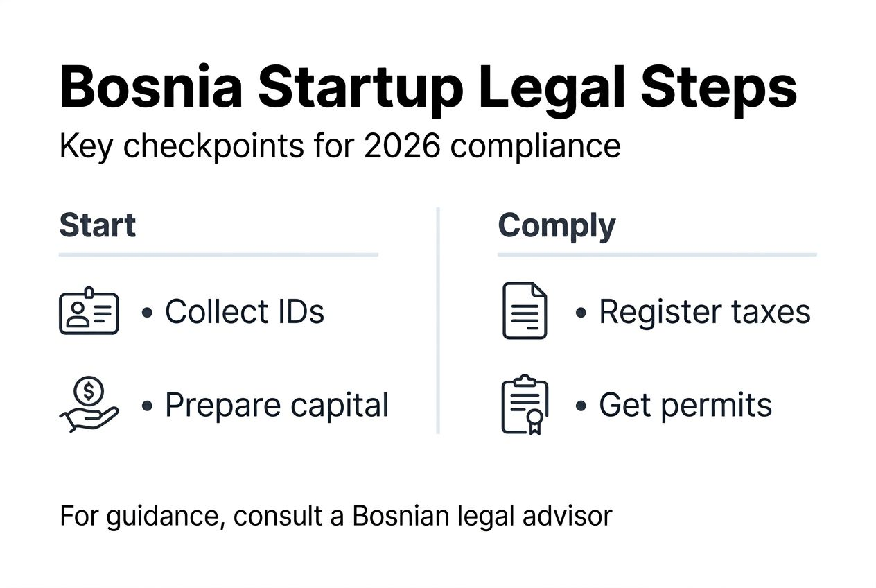 Starting a business in Bosnia and Herzegovina means navigating a dense web of legal requirements that many founders underestimate. Over 25% of startups face legal disputes within their first year simply because they missed critical compliance steps. This comprehensive checklist walks you through every essential legal requirement, from pre-launch preparation to post-incorporation registrations, so you can launch confidently and avoid costly penalties.
