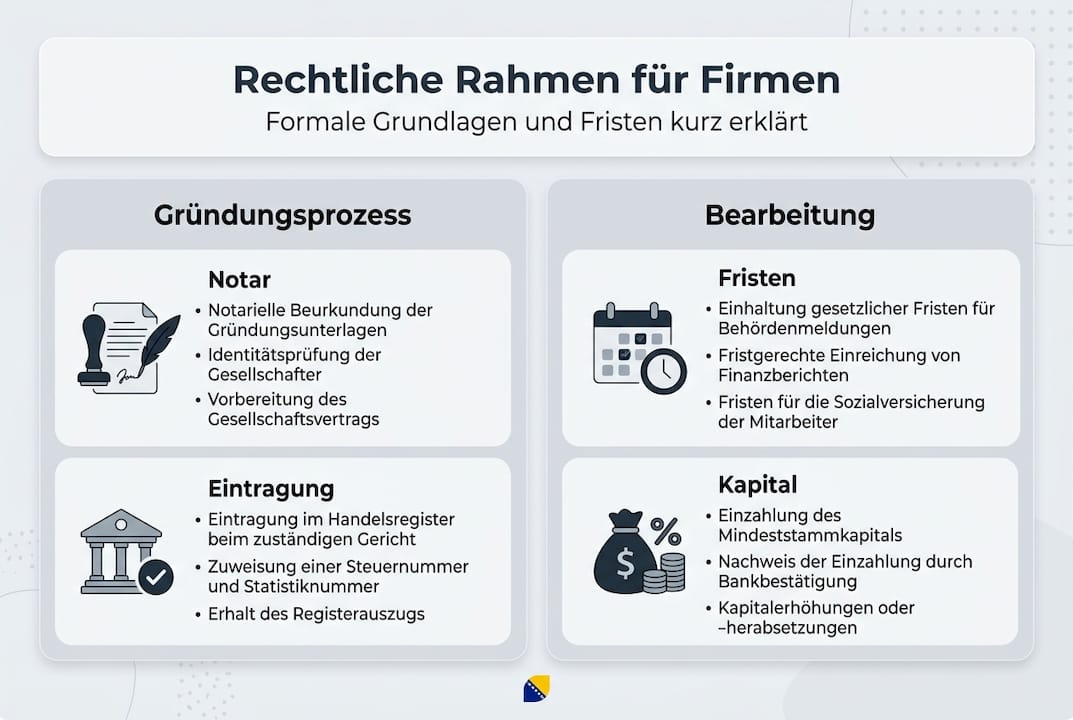 Nach den wichtigsten Erkenntnissen folgt die detaillierte Darstellung der formalen Grundlagen. Die Gründung einer d.o.o. in BiH erfordert spezifische Schritte, die Sie präzise befolgen müssen. Der Gründungsakt muss notariell beurkundet werden, bevor Sie ihn beim zuständigen Gemeindegericht einreichen können. Diese notarielle Beurkundung, Gemeindegerichtseinreichung und Kapitaleinzahlungsnachweis bilden die zentrale Mechanik bei der Unternehmensgründung.